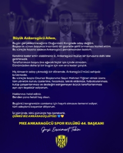 Ankaragücü’nde yapılacak olağanüstü kongre öncesi mevcut başkan Gazi Ercüment Tekin, aday olmayacağını açıkladı. Sosyal medya hesabından camiaya hitaben bir mesaj yayımlayan Tekin, başkanlık süreci boyunca büyük bir gayretle çalıştığını ve Ankaragücü’nün hiçbir kuruşuna leke getirmediklerini ifade etti.